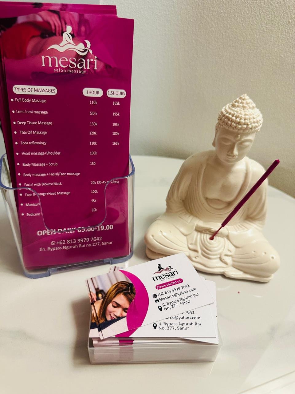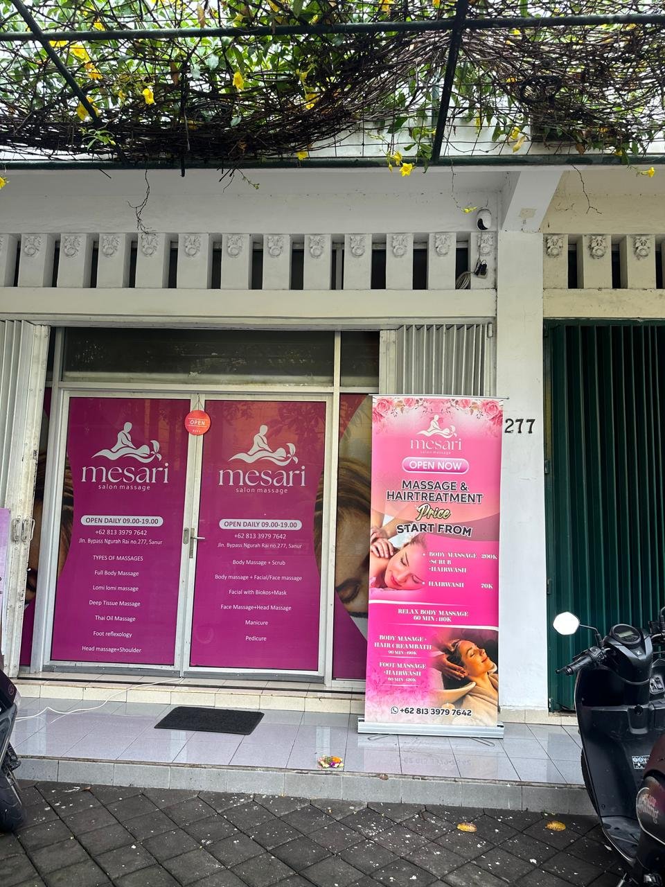 MESARI SALON MASSAGE & SPA adalah salon dan layanan pijat profesional yang berlokasi strategis di pinggir jalan besar, mudah ditemukan dan nyaman dikunjungi. Kami menyediakan berbagai pilihan perawatan tubuh dan kecantikan untuk membantu Anda rileks, segar, dan tampil percaya diri. Layanan kami meliputi berbagai jenis massage seperti Full Body Massage, Lomi-Lomi Massage, Deep Tissue Massage, Thai Oil Massage, Foot Reflexology, hingga kombinasi Body Massage + Scrub atau Facial. Kami juga menyediakan Facial dengan Biokos Mask, Face & Head Massage, serta perawatan kecantikan seperti Manicure dan Pedicure. Selain itu tersedia treatment rambut seperti Hairwash, Creambath, dan Hairmask untuk perawatan rambut sehat dan berkilau.